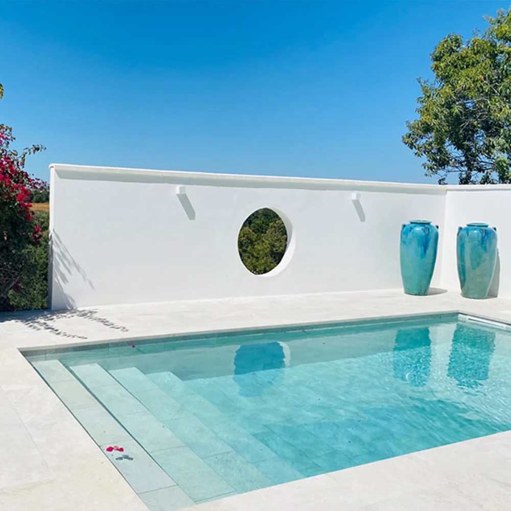 Piscine béton : Pour ce type de piscines, n’importe quelle échelle de construction peut être installée ; arrondie, angulaire ou rectangulaire. Si la piscine est petite, des escaliers en acier inoxydable préfabriqués peuvent être installés.