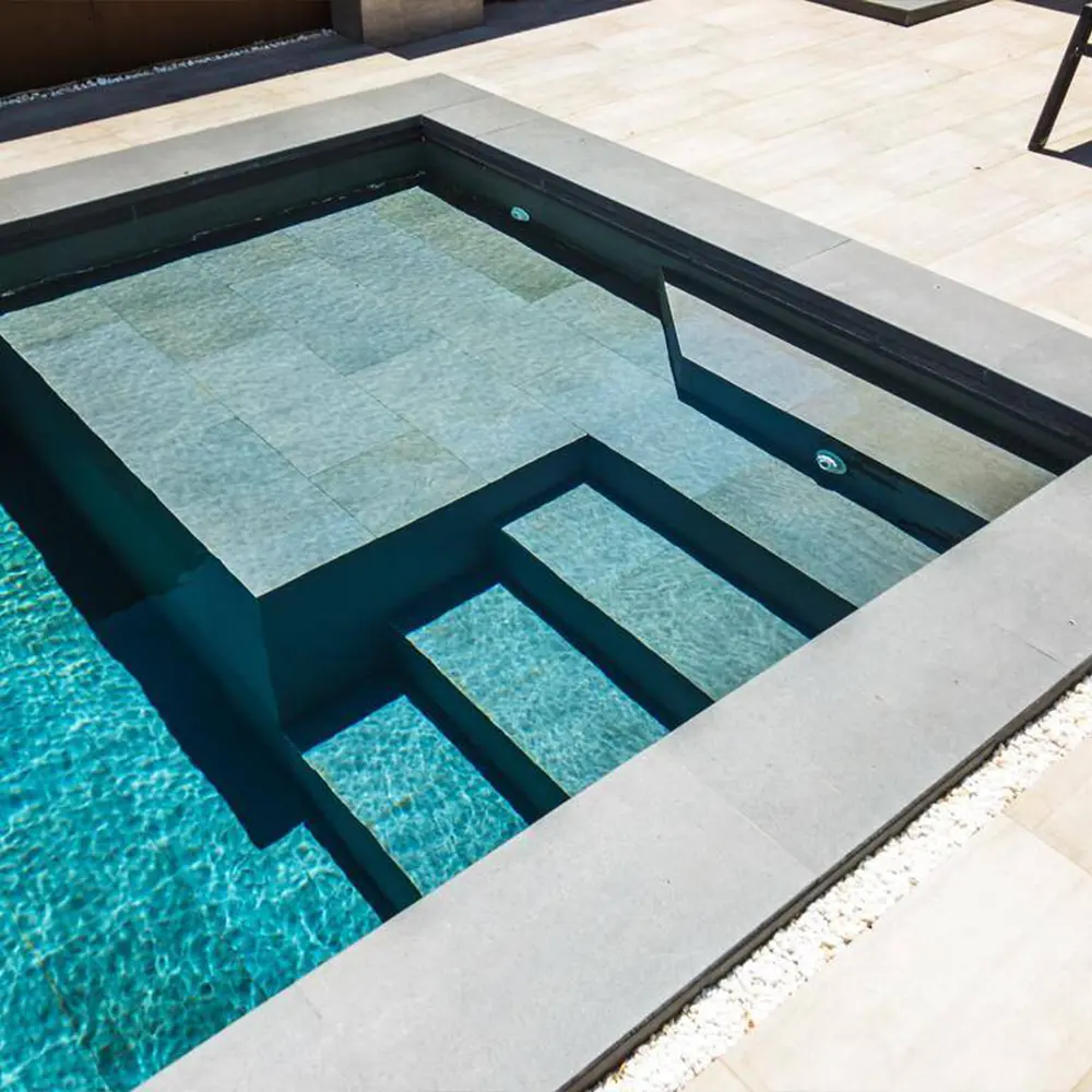 Ce sont les escaliers en forme de rectangle ou de carré qui sont construits sur les côtés de la piscine. Son utilisation a gagné en force car ils lui donnent un look moderne. Ils sont presque toujours construits avec de larges marches et ils ne font pas plus de 4 marches. Il peut être installé dans des piscines de différentes formes et servir également de sièges. Il est généralement utilisé dans les piscines avec revêtement de Pierre de Bali.