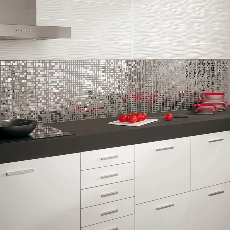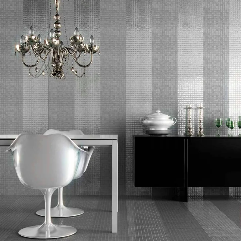 Vous pouvez l’utiliser pour décorer de manière stratégique des espaces réduits, ou bien la combiner avec d’autres couleurs pour mettre en valeur la beauté et la lumière de votre environnement dans des zones plus grandes. Les mosaïques argentées ajoutent une touche subtile de brillance, et en les mélangeant à des couleurs traditionnelles, elles créent une sensation d’espace tout en apportant un aspect original et frais.